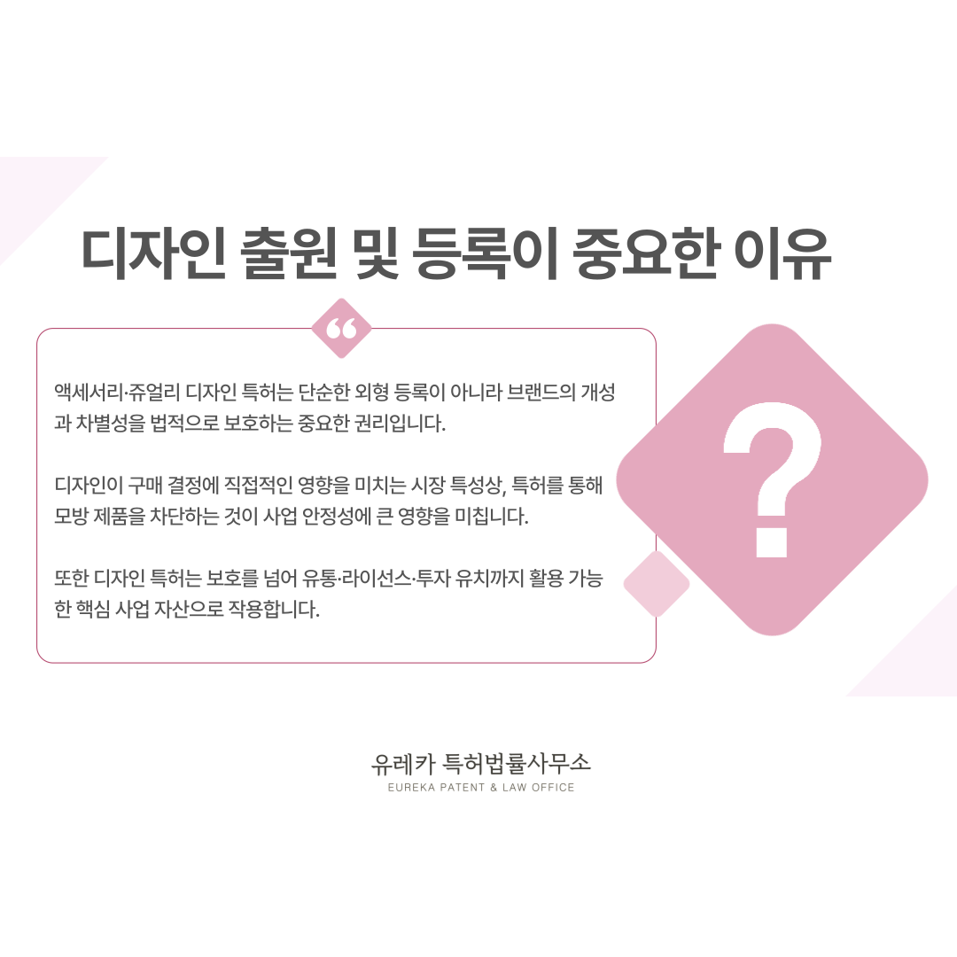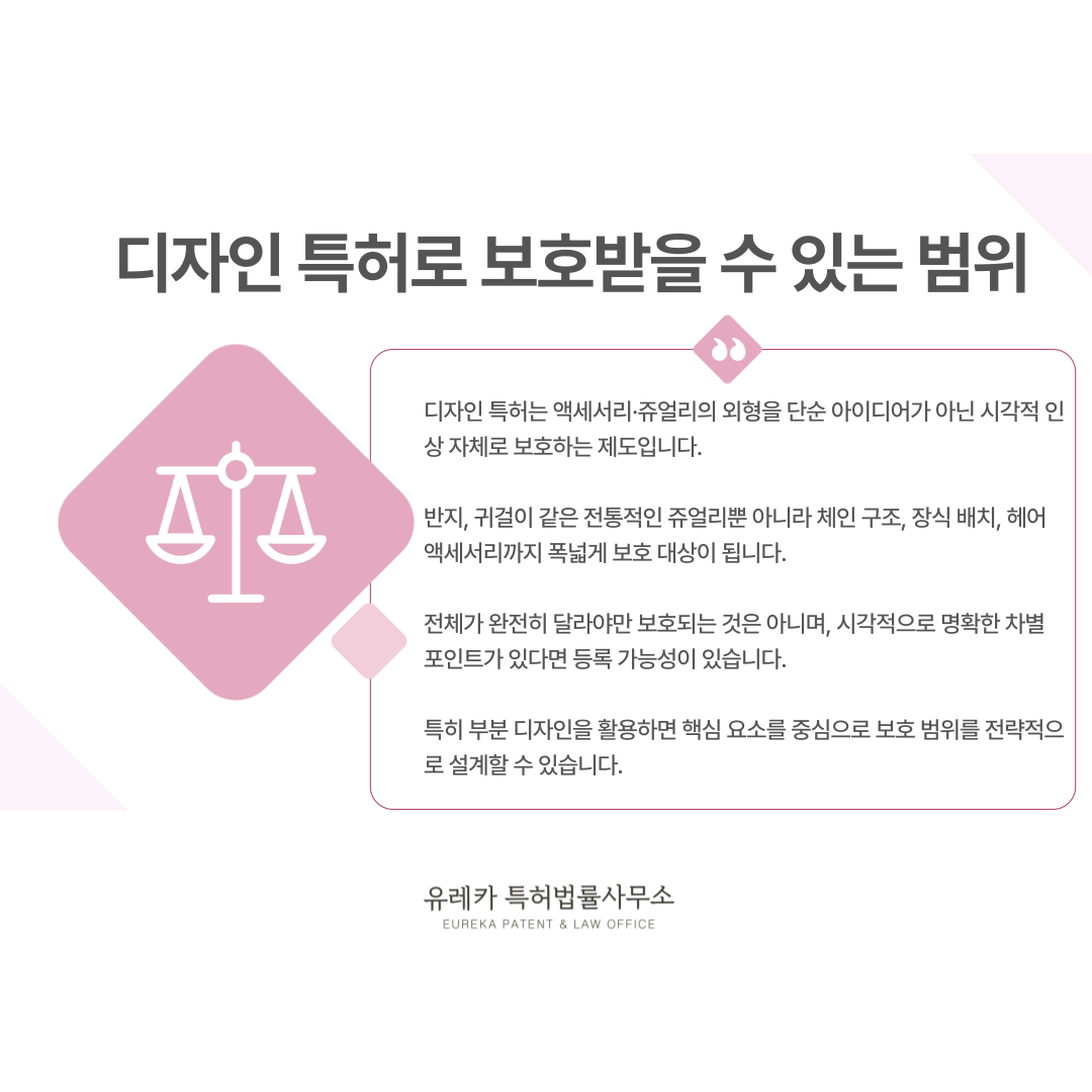 특히 디자인이 구매 결정에 직접적인 영향을 미치는 액세서리·쥬얼리 분야에서는 디자인 보호 여부가 사업 성패를 좌우하기도 합니다.