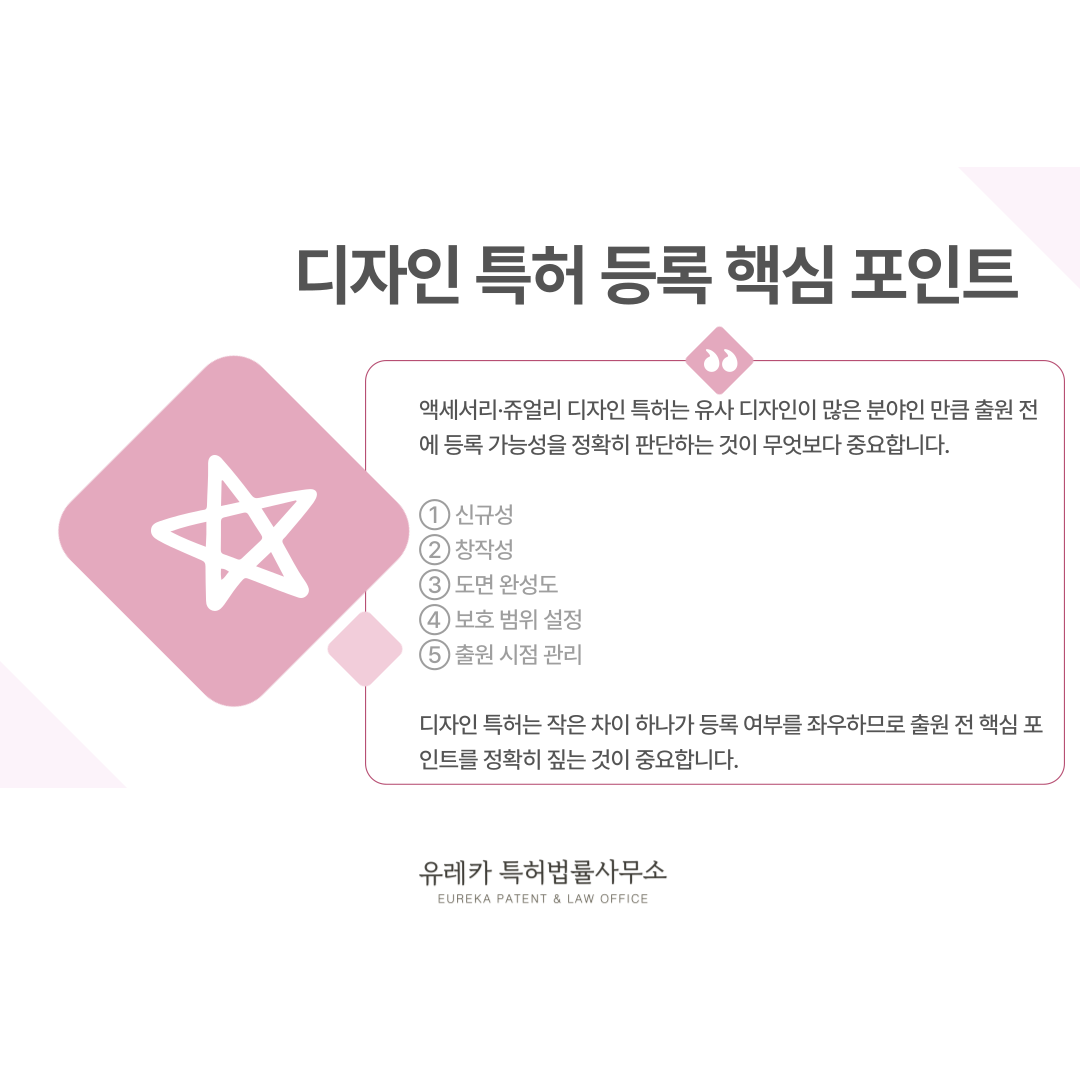 특히 액세서리·쥬얼리 분야는 이미 유사한 디자인이 매우 많아 등록 가능성 판단이 까다로운 편입니다.