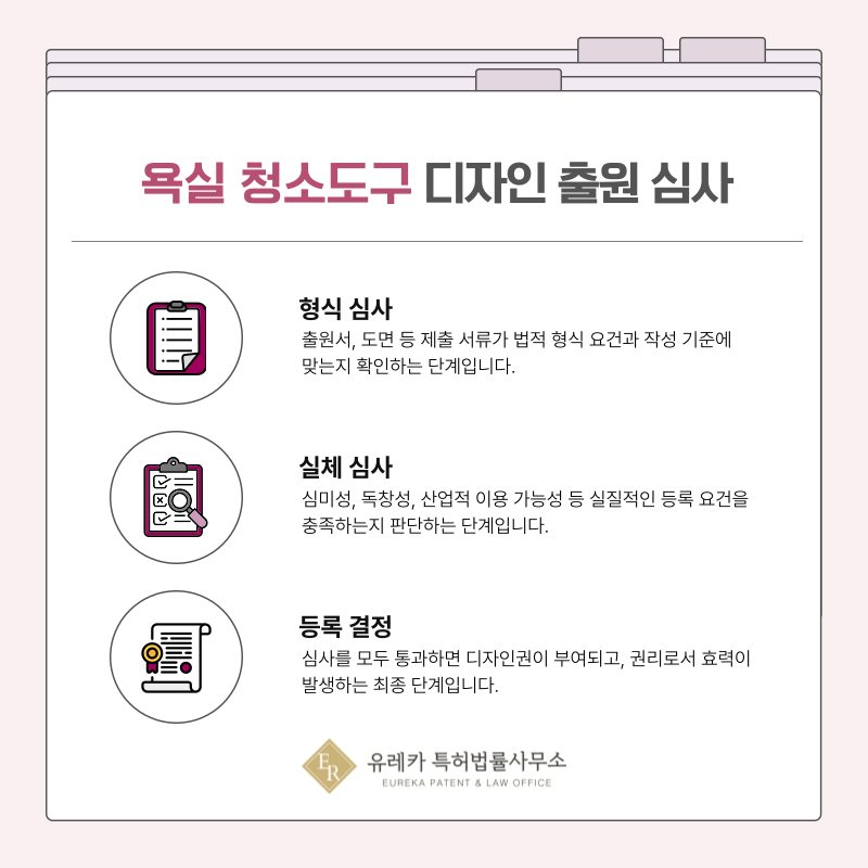 청소솔, 브러시, 스펀지, 수세미, 유리닦이, 스퀴지, 변기솔, 먼지털이 디자인이 출원되면 먼저 형식심사가 진행됩니다.