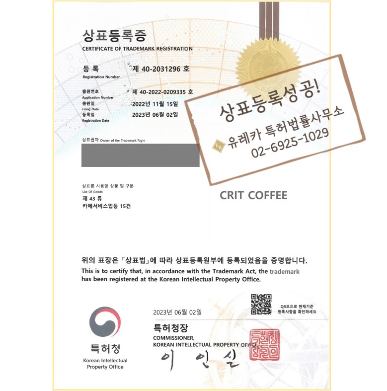 카페, 식음료, 프랜차이즈 "CRIT COFFEE" 유레카에서 상표등록 완료!
