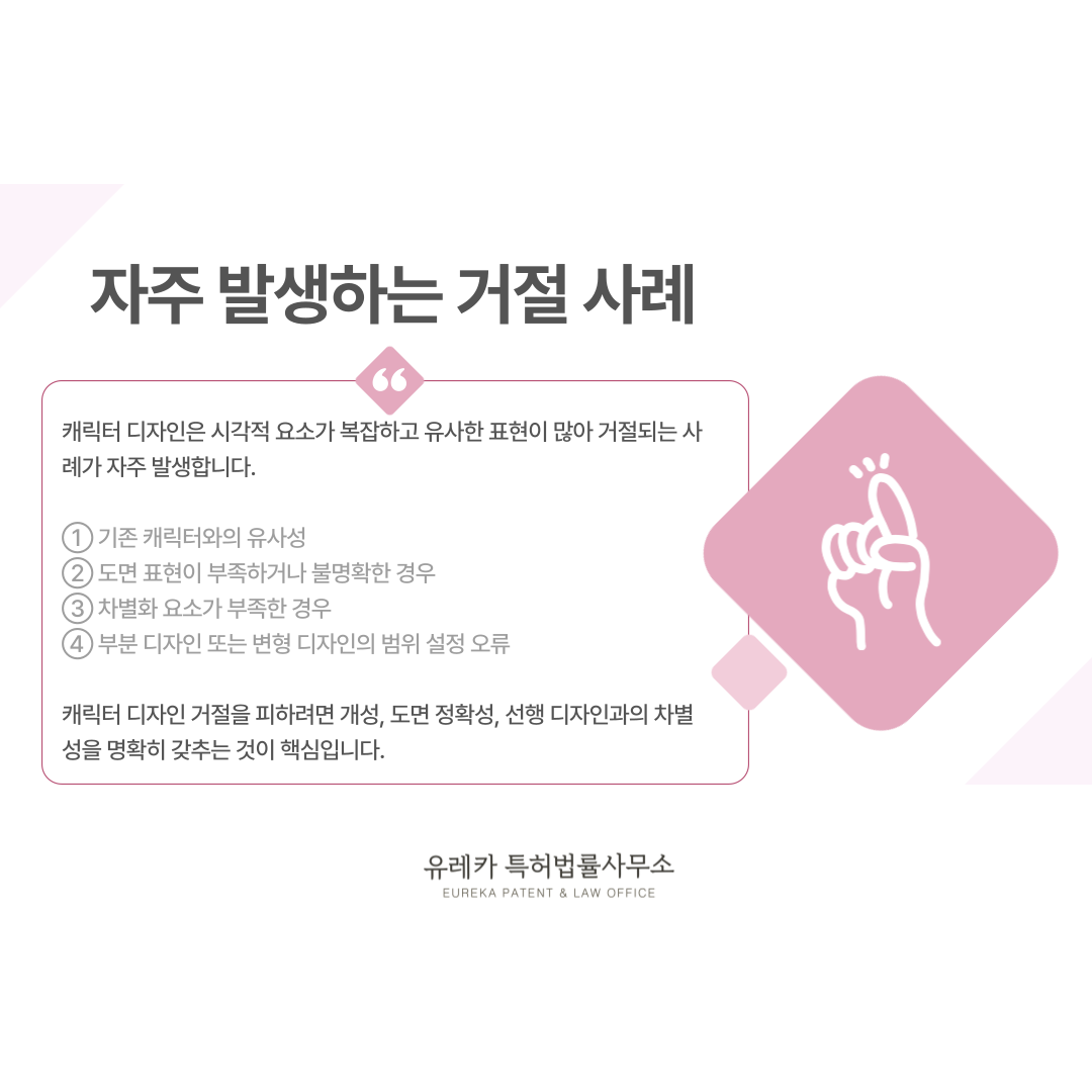 캐릭터 디자인은 시각적 요소가 복잡하고 유사한 표현이 많아 거절되는 사례가 자주 발생합니다.