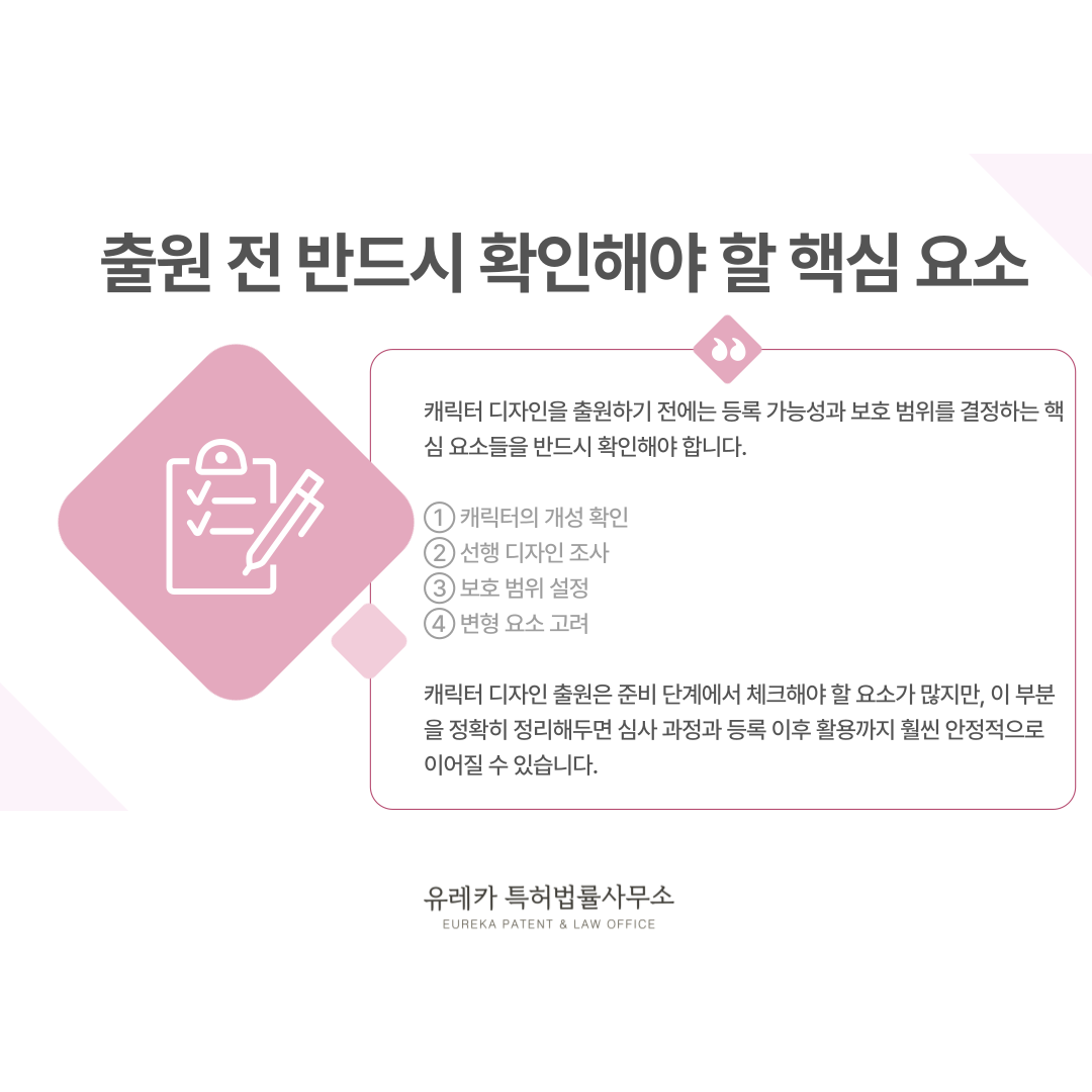 출원 전에 캐릭터만의 특징과 구조가 명확하게 드러나는지 반드시 점검해야 합니다.