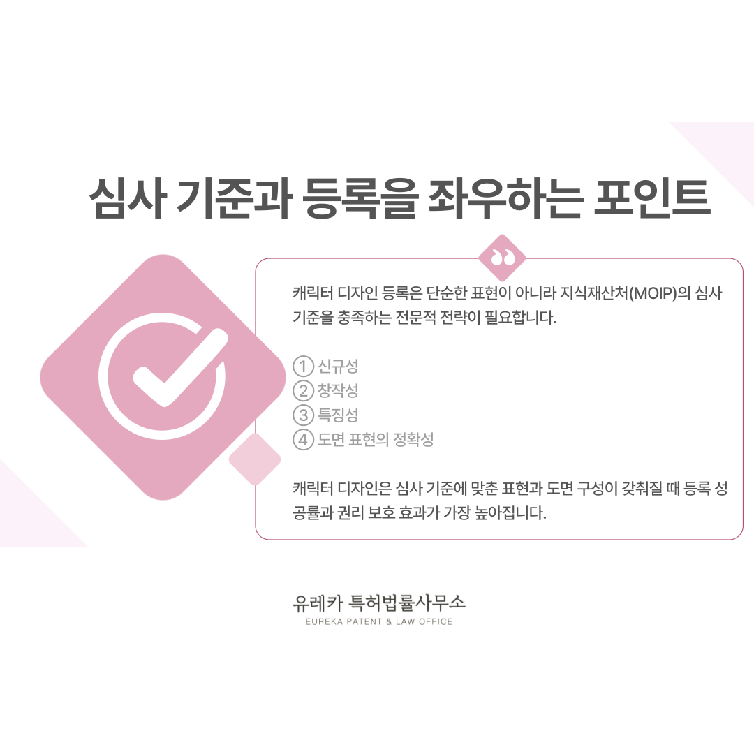 캐릭터 디자인이 등록되기 위해서는 지식재산처(MOIP, 구 특허청)의 심사 기준을 충족해야 하며, 이 기준을 얼마나 정확히 반영했는지가 등록 결과를 크게 좌우합니다.