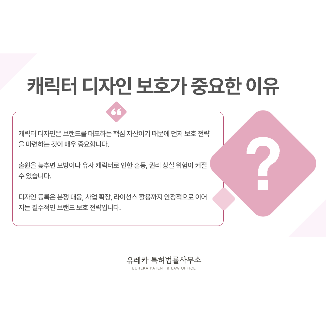 캐릭터 디자인은 단순한 이미지가 아니라 브랜드를 대표하는 중요한 자산이기 때문에 보호 전략이 반드시 필요합니다.