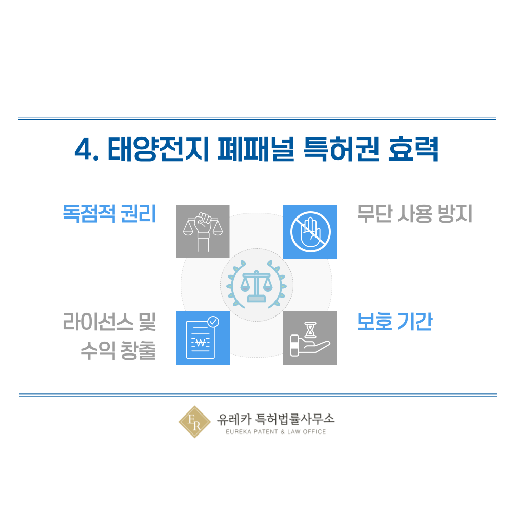 특허권이 등록되면 해당 기술에 대해 독점적으로 사용할 권리를 갖게 됩니다. 즉, 출원인이 개발한 태양전지 폐패널 처리 기술이나 재활용 방식은 다른 사람이 허락 없이 제조, 판매, 사용할 수 없습니다. 이를 통해 기술을 보호하고, 시장에서 기술적 우위를 확보할 수 있습니다.