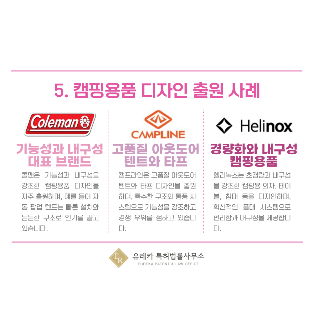 예를 들어, 콜맨의 자동 팝업 텐트는 빠르게 설치할 수 있는 독특한 구조와 형태로, 사용자 편리성을 중시한 디자인이 출원되었습니다.