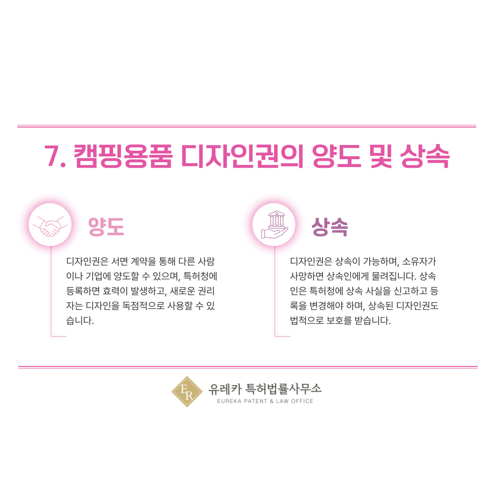 예를 들어, 캠핑용품 회사의 창립자가 사망하면, 그가 보유한 텐트 디자인권은 그의 상속인에게 넘어가며, 상속인들이 이를 계속 관리하거나 양도할 수 있습니다.