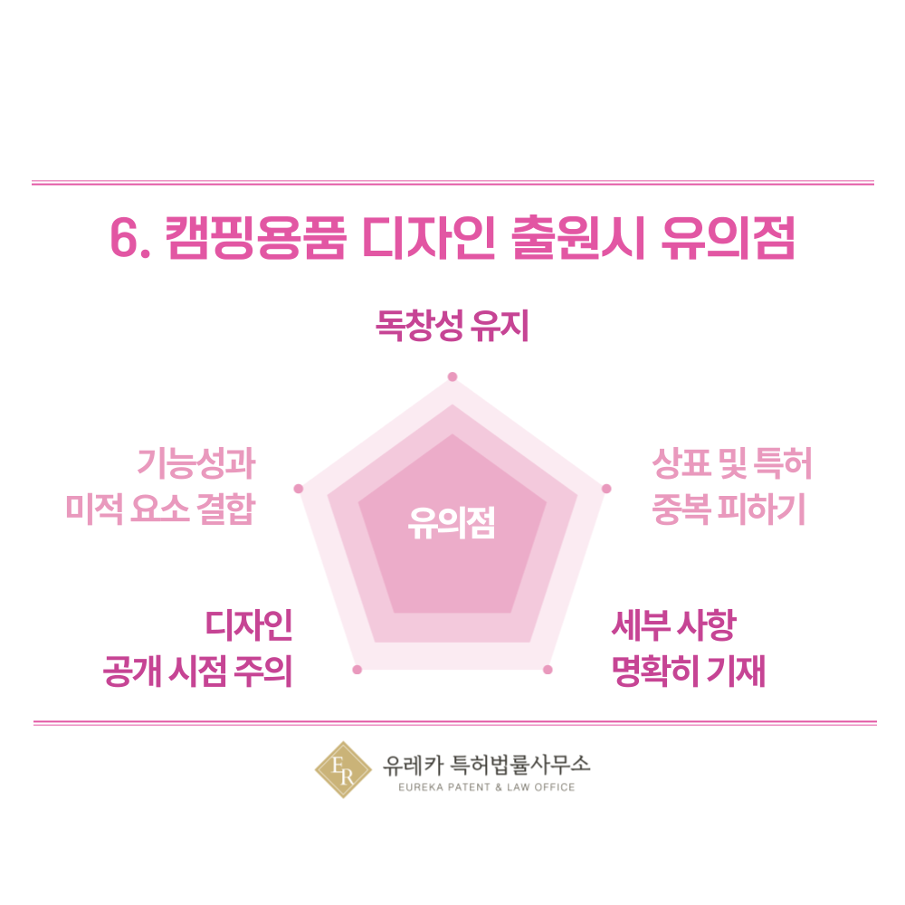 캠핑용품은 기능적 요소와 미적 요소가 결합된 제품들이 많기 때문에, 디자인 출원 시 이 두 가지 요소가 잘 조화되도록 해야 합니다.