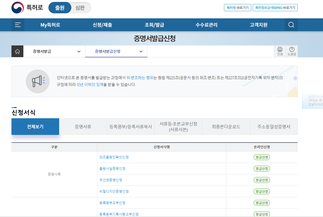 관련 웹사이트(특허로 누리집)를 통해 확인하고, 추가 비용 없이 발급받을 수 있습니다.