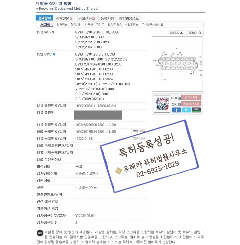 재활용 장치, 기계, 기술분야 "재활용 장치 및 방법" 유레카에서 특허등록 완료!