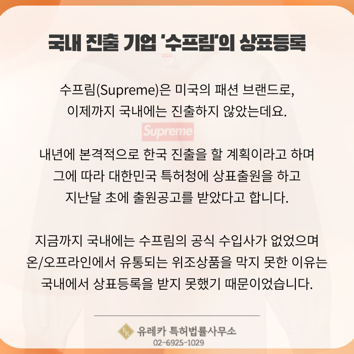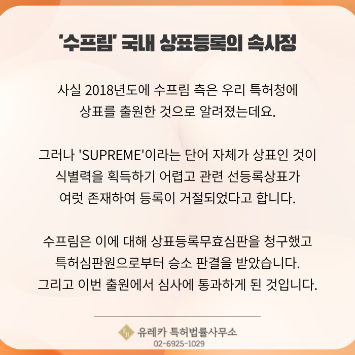 수프림 본사가 국내에서 패션 브랜드 상표 출원 등록을 받지 못했기 때문이었습니다.