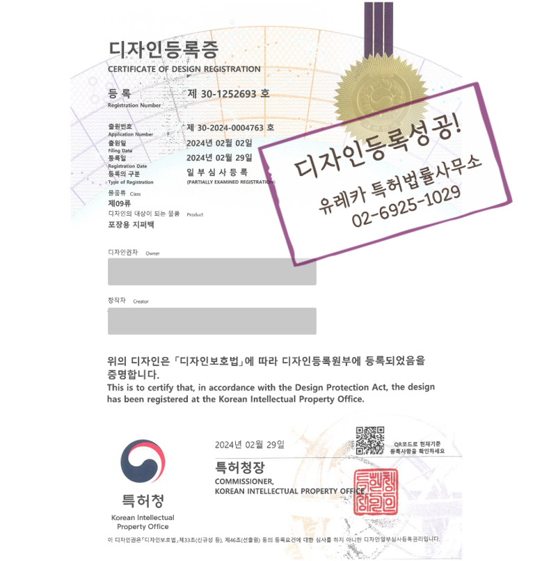 유레카 특허법률사무소에서 '패키지 디자인등록'을 완료했습니다!