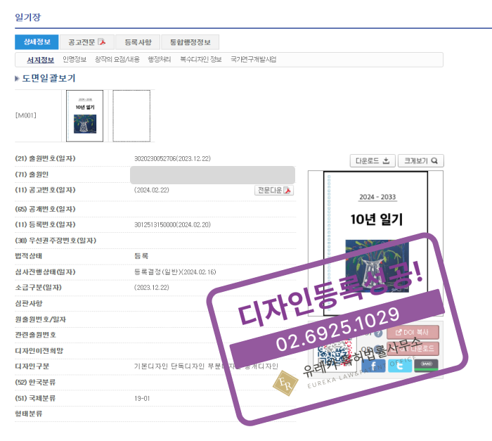 디자인검토와 컨설팅을 통해서 디자인심사를 통과해, 최종적으로 일기장 디자인등록에 성공하였습니다!