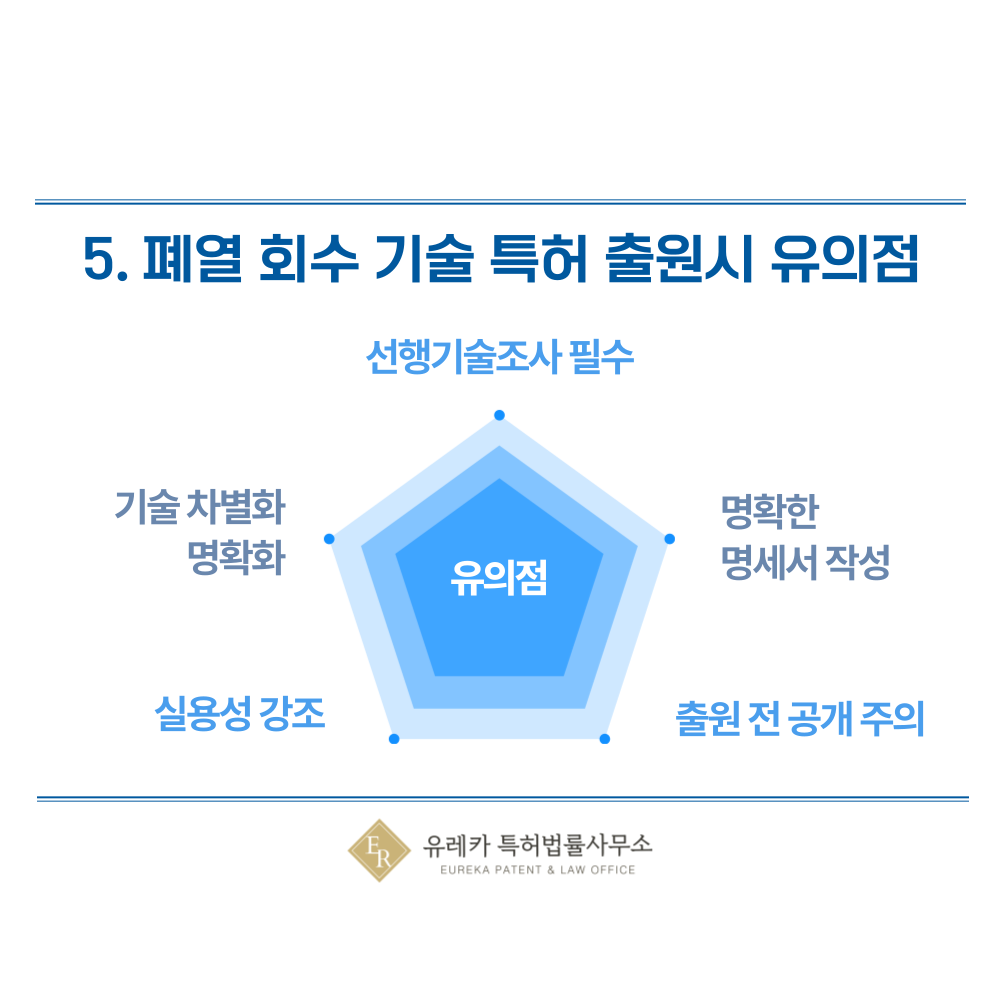 특허 심사에서 가장 중요한 것은 기존 기술과 구별되는 뚜렷한 차별성입니다. 단순히 열을 모으는 방법이 아니라 효율을 높이는 새로운 구조, 환경적 효과를 극대화하는 공정, 비용 절감을 실현하는 방식처럼 구체적인 차별성을 제시해야 합니다. 이를 명확히 정리해두면 등록 가능성이 높아지고 권리 범위도 넓어집니다.