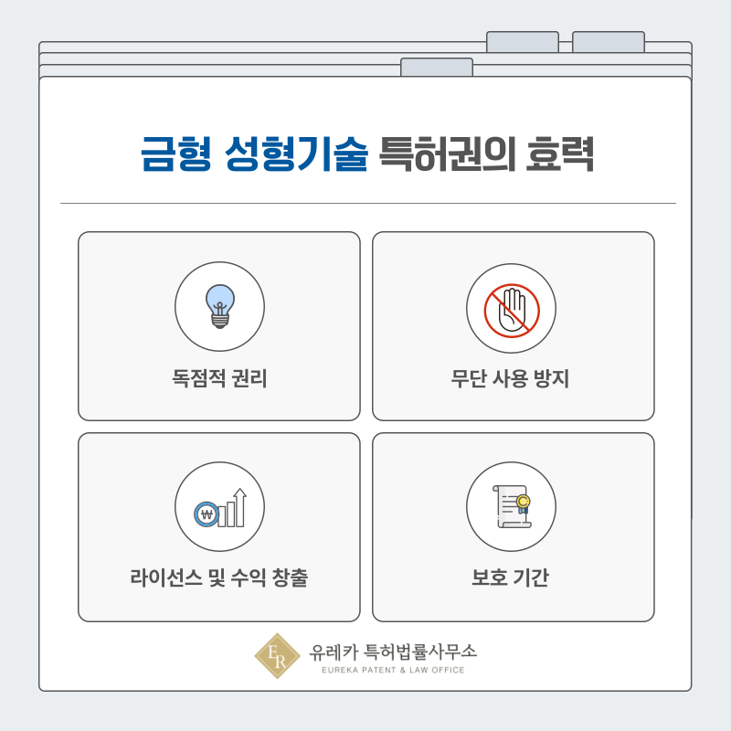 특허권이 등록되면 제3자가 허락 없이 해당 금형 기술을 사용하는 것을 법적으로 막을 수 있습니다.