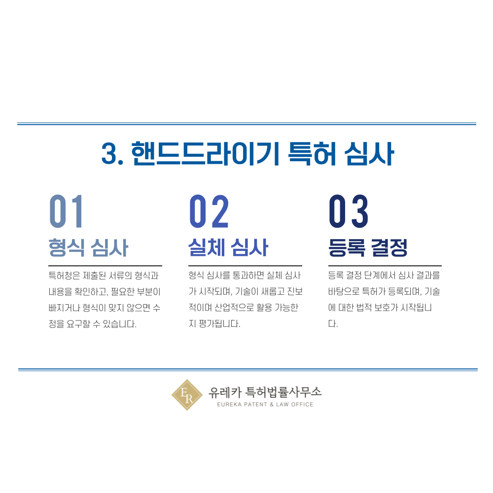 먼저 서류의 형식을 보는 형식심사가 진행되고, 이후 기술 내용을 평가하는 실체심사가 이루어져요.