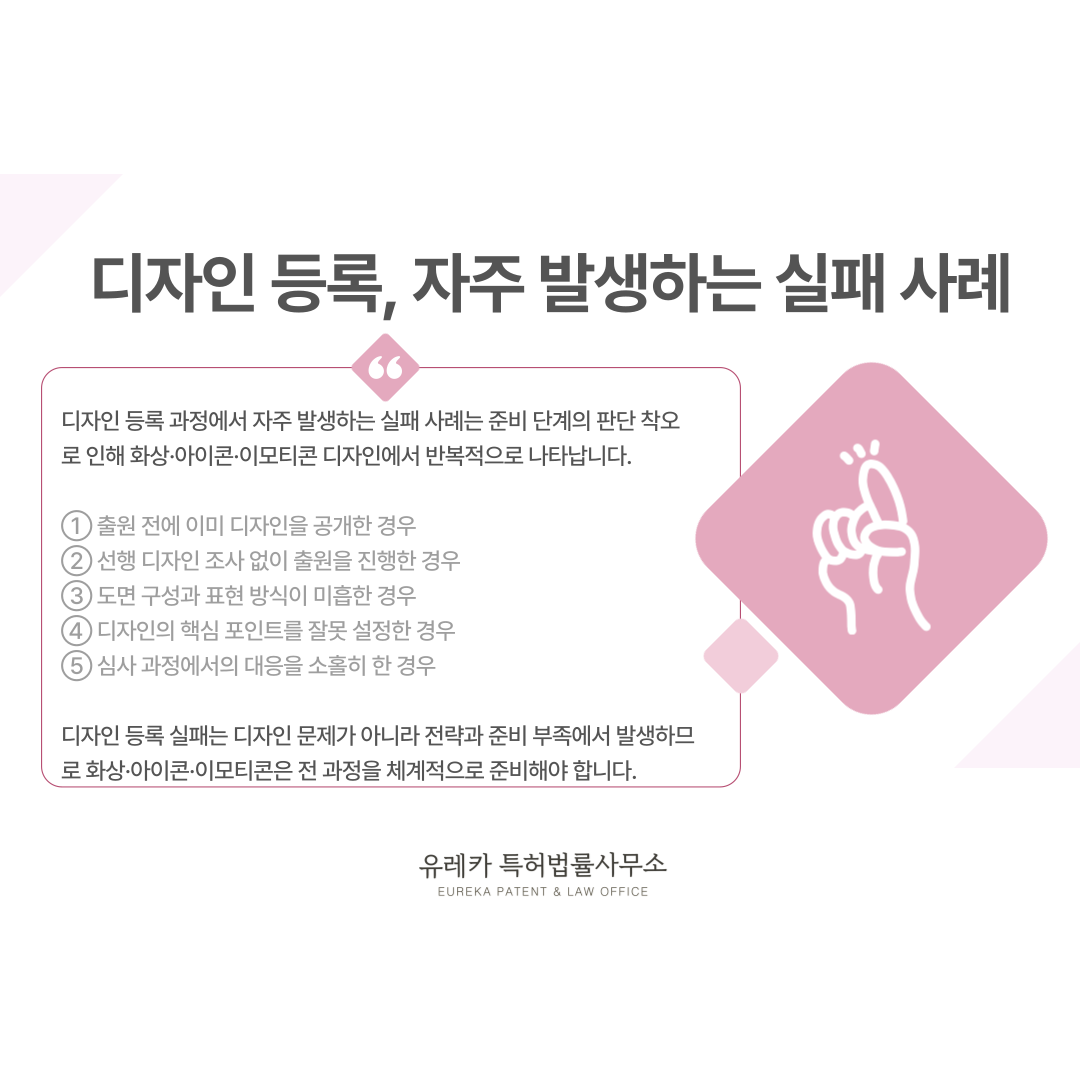 디자인 등록 과정에서 자주 발생하는 실패 사례는 디자인 자체의 문제가 아니라 준비 과정과 전략의 문제인 경우가 대부분입니다.