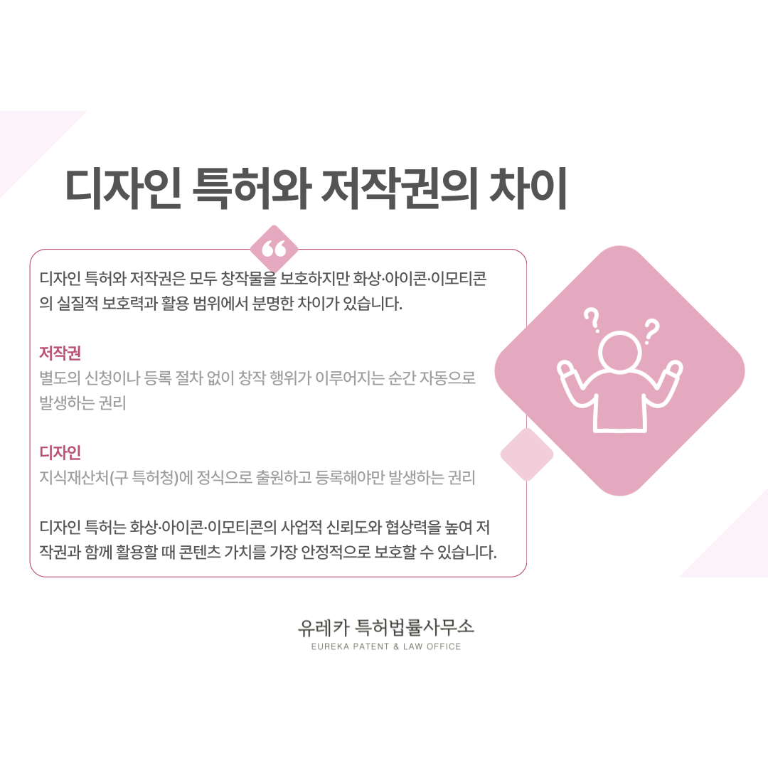 디자인 특허와 저작권의 차이는 화상·아이콘·이모티콘과 같은 디지털 디자인을 실제로 보호하려는 분들께서 반드시 정확히 이해하셔야 하는 핵심 포인트입니다.
