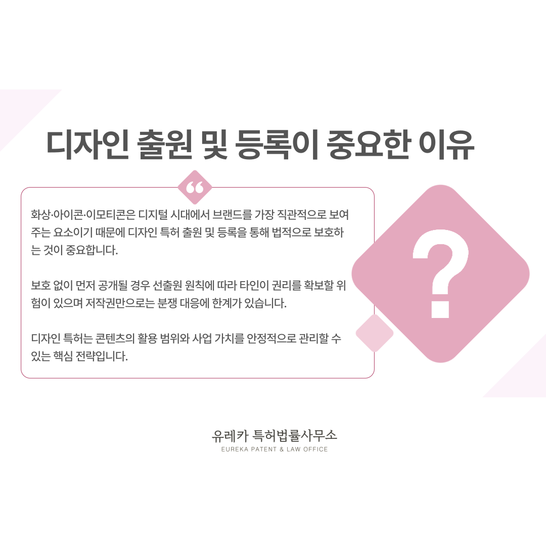 화상·아이콘·이모티콘 디자인 특허 출원 및 등록이 중요한 이유는 디지털 콘텐츠가 곧 브랜드의 얼굴이 되는 시대이기 때문입니다.