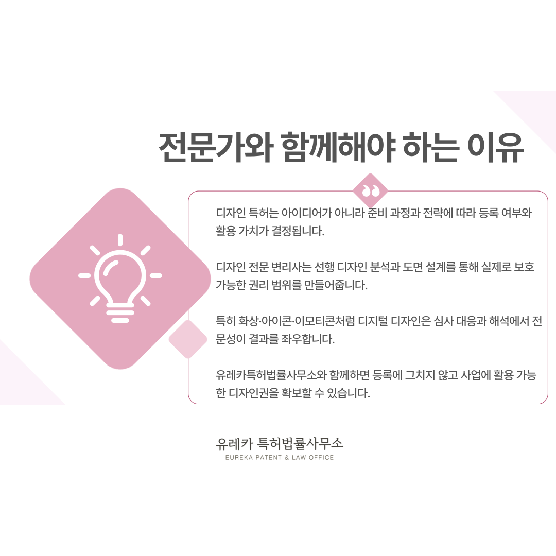 유레카특허법률사무소는 화상·아이콘·이모티콘과 같은 디지털 디자인 특성을 이해하는 변리사가 직접 전략을 설계합니다.