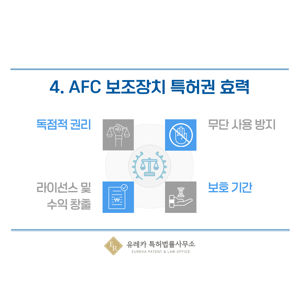 특허권은 타인이 발명을 허락 없이 사용하는 것을 강력하게 막아줍니다. 만약 경쟁사가 AFC 보조장치를 무단으로 제조하거나 판매한다면, 권리자는 이를 중단시킬 수 있는 청구권을 행사할 수 있습니다. 법원에 침해금지청구나 손해배상청구를 제기할 수 있고, 이는 불법적인 시장 잠식을 방지하는 중요한 수단이 됩니다. 무단 사용 방지 기능은 단순히 법적 억제력뿐 아니라 권리자의 기술적·경제적 가치를 보호하는 장치로 작동합니다. 이를 통해 발명자는 안심하고 연구와 사업을 이어갈 수 있습니다.
