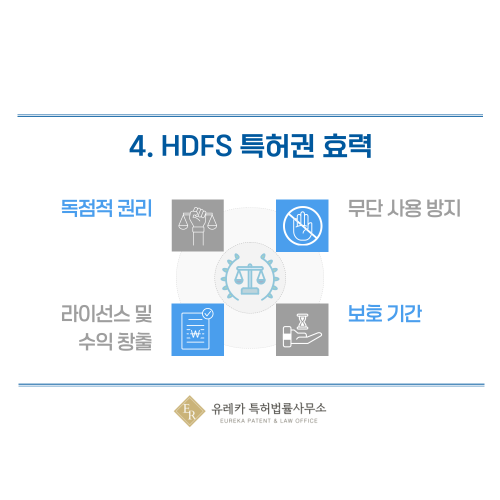 HDFS 관련 기술이 특허로 등록되면, 해당 기술은 내가 독점적으로 사용할 수 있어요. 다른 사람이 함부로 쓸 수 없어요.