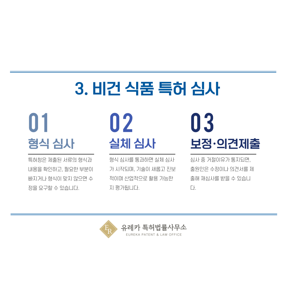 이후 심사관이 비건 식품, 플랜트 베이스드, 락토, 오보 관련 기술이 정말 새로운지(신규성), 기존과 어떤 차별점이 있는지(진보성), 실제로 시장에서 활용 가능한지(산업적 이용 가능성) 등을 꼼꼼하게 심사해요.