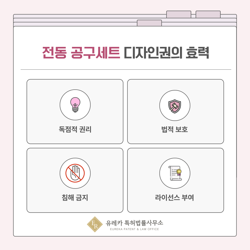 정밀 공구 세트나 전동·절삭 공구 디자인이 등록되면 해당 디자인을 독점적으로 사용할 수 있는 권리가 발생합니다.